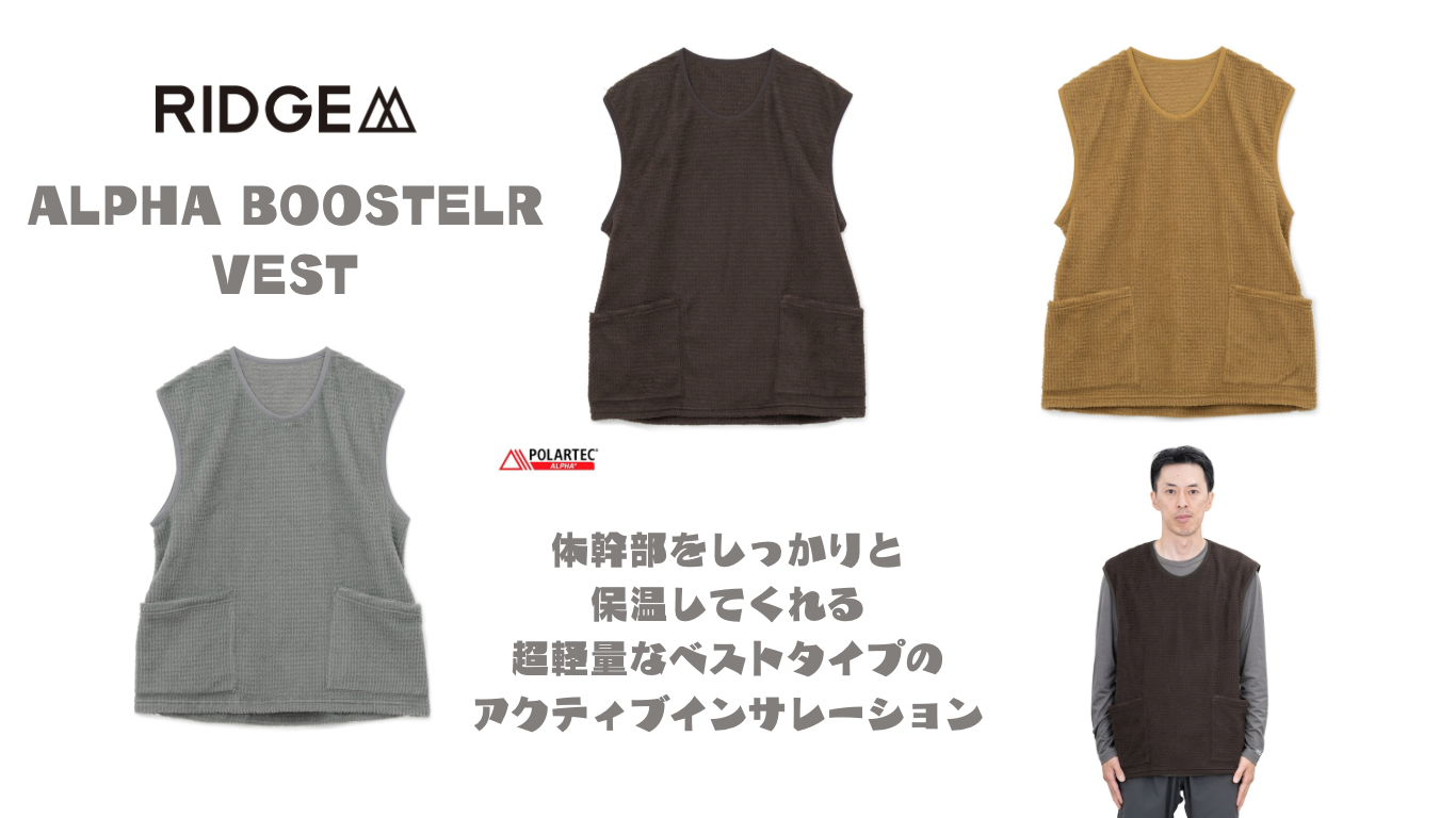 本日は冬季のアウトドアアクティビティーはもちろん、春秋、約99g(Women/M)と超軽量なため、夏のアルプス縦走時のお守り代わりの保温着としても、活躍してくれる汎用性の高いRIDGE MOUNTAIN GEAR、Alpha Booster Vestをご紹介いたします。