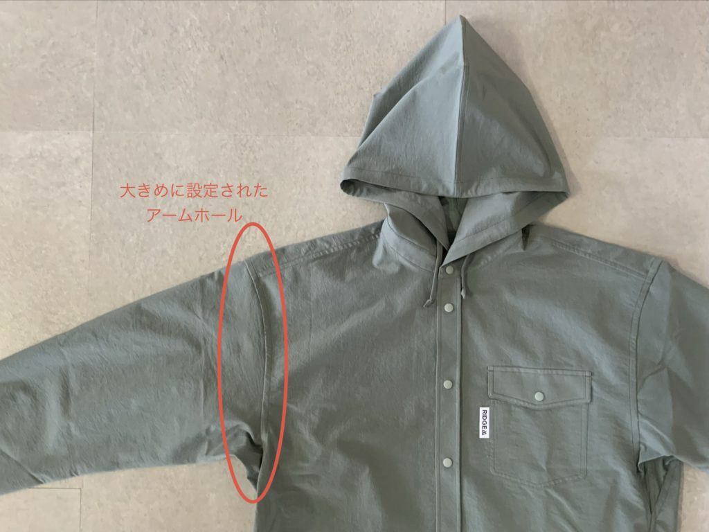 またアームホールが大きめに設定されており、腕上げがしやすい仕様なため、トレッキングポールの操作や、手を使うような少しハード目なルートでもストレスフリーな着心地です。