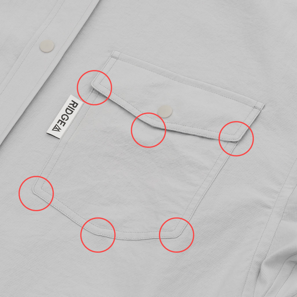 袖口カフスの角、胸ポケット本体&フラップ端など小さなラウンド形状にされたこだわりの仕様。摩耗を軽減し、ほころびを抑制してくれます。